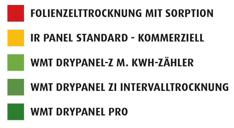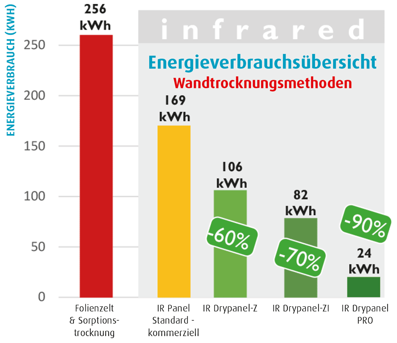 Beim Vergleich des Energieverbrauchs verschiedener Mauertrocknungsmethoden erweist sich Drypanel PRO eindeutig als die effizienteste Lösung.