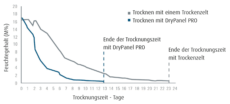 Infrarot DryPanel® von WMT beschleunigt erfolgreich die Sanierung von Wasserschäden und die Reduzierung von Feuchtigkeit in Wänden usw. Die Feuchtigkeit wird durch gleichmäßige Erwärmung der Bausubstanz mit Infrarot-Strahlungswärme entfernt und durch Verdunstung effektiv an die Raumluft abgegeben.