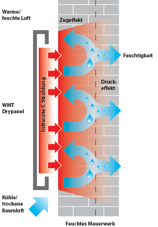 Mit der WMT FlatPanel-Technologie wird auf der inneren Heizplatte Infrarot-C-Strahlung erzeugt, die zunächst die Wandoberfläche und den Luftraum zwischen Platte und Mauerwerk erwärmt.