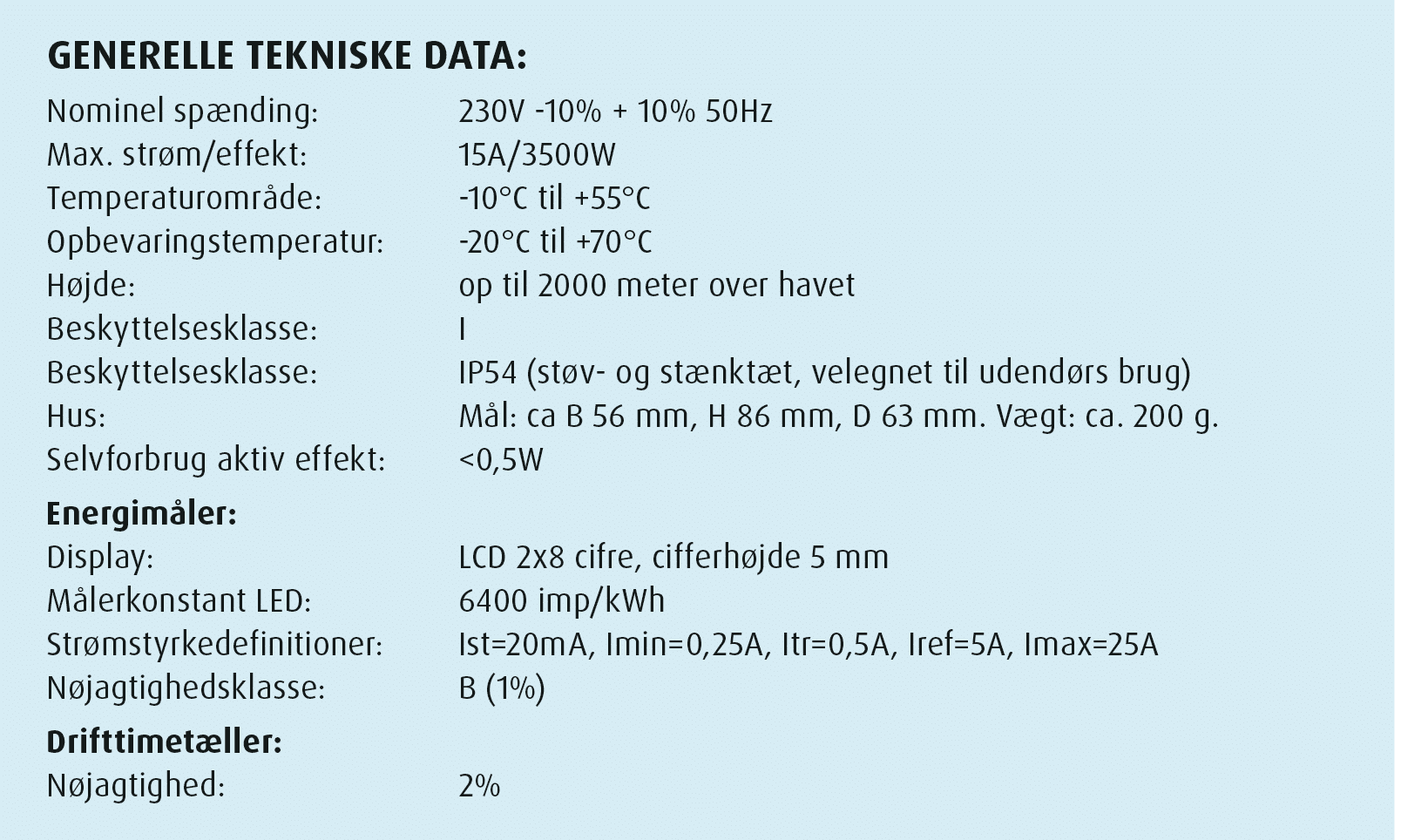 Die verbrauchte Energie wird in Schritten von 0,0 kWh gezählt und angezeigt. Der Zählerstand wird nach jeder Änderung dauerhaft in einem nichtflüchtigen* Speicher gespeichert (Datenspeicherung > 10 Jahre). Die LED auf der Vorderseite blinkt entsprechend der aktuell verbrauchten Energie: langsames Blinken = niedriger Energieverbrauch, schnelles Blinken = hoher Energieverbrauch. Die Zählerkonstante der LED beträgt 6400 Imp/kWh.