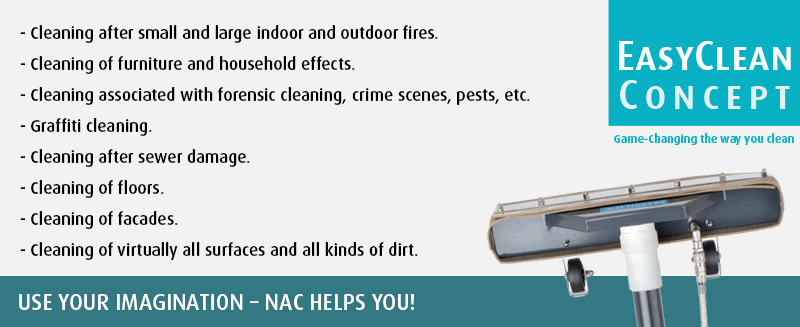 Many cleaning tasks in the claims service industry involve contact with harmful substances such as soot, fecal matter, blood and other heavy organic/biological contamination. Currently, there is a lot of focus on the cancer risk when firefighters are exposed to toxic and carcinogenic soot particles on their fire suits and other equipment. The same is true for claims handlers. When emergency services arrive at the fire scene, the smoke is gone, but the air may still contain a large number of soot particles. With current manual cleaning methods, rags and buckets, it is inevitable that the claims handler is exposed to toxic soot on work clothes, skin and by inhaling particles.