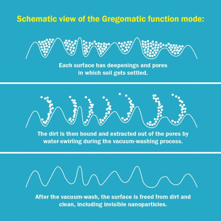 Gregomatic is a concept that focuses on sustainability in every respect. A robust, reliable, energy- and water-saving device that is able to deep clean pores while removing wastewater and protecting the surface itself and the environment. An advanced yet uncomplicated system with winning ease of use and versatility. Gregomatic completely and gently removes not only common dust and dirt, but also grease, bacteria and toxins from surfaces of all materials and structures.