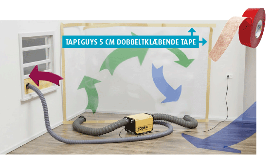 Dobbeltklæbende indeslutningstape giver en et-trinsløsning, der erstatter den traditionelle to-trinsmetode (først påføring af malertape og derefter brug af en anden tape til at fastgøre polyfolien). Montage med 2-i-1 tape fra TapeGuys kan gøres på halv tid i.f.t gammel metode, den holder og er hurtigt og nemt fjernet igen.